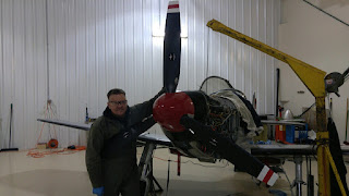 Most recently, the spinner was added and the engine was tested. Here is EZ giving his bird a "hug":