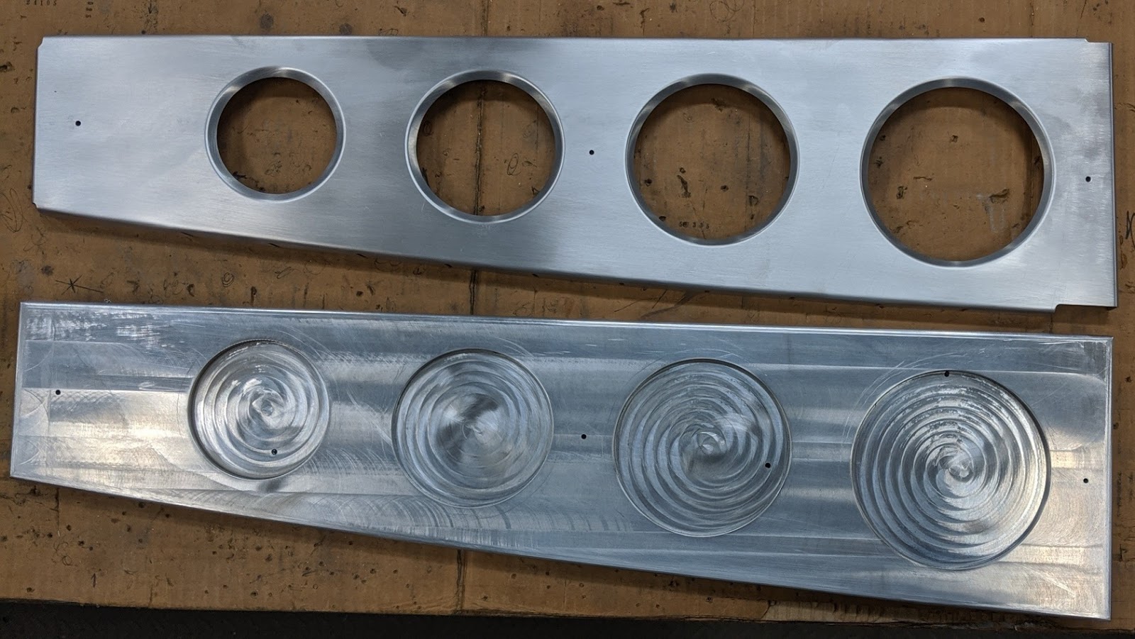 Next, I had to fire up the router and cut some blanks for forming over the dies. That took the better part of a day - I ran into several obstacles and had to re-CAM each of the cut files for the router control. Once I got that done, I grabbed the die and pressed the part. It came out awesome! Here is the formed part and the die below it: